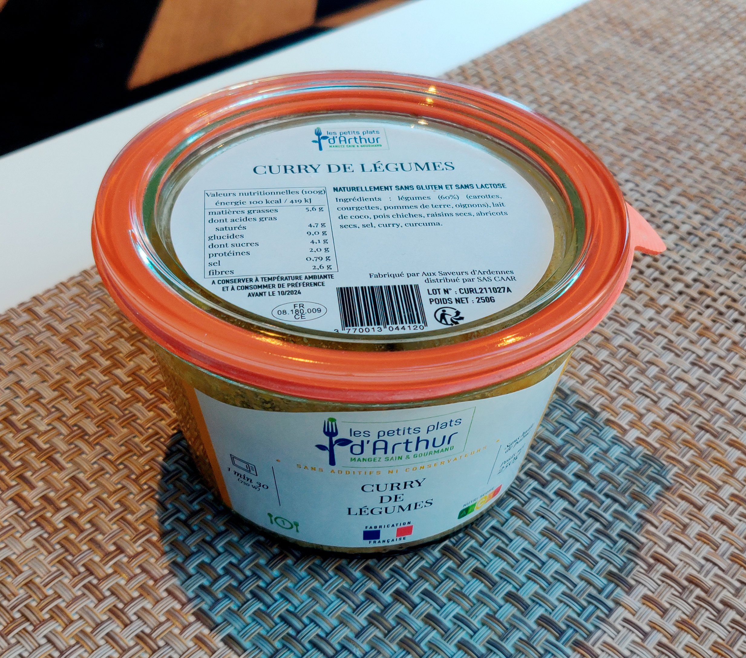 Ingrédients : légumes (60%) (carottes, courgettes, pommes de terre, oignons), lait de coco, pois chiches, raisins secs, abricots secs, sel, curry, curcuma.